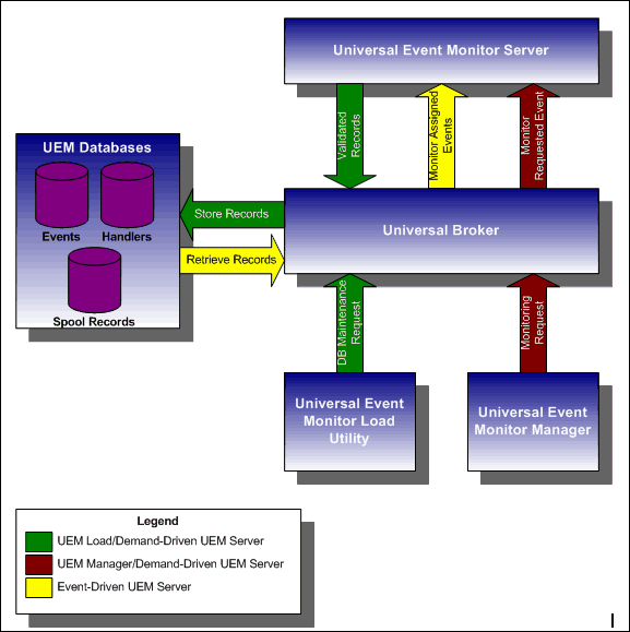 UEMLoad handles all event definition and event handler database management tasks, including adds, updates, deletes, and lists / exports. UEMLoad forwards a database request to a UEM Server, which validates the information. The UEM Server then sends a request to a local Universal Broker to apply the requested operation to the appropriate UEM database file.
