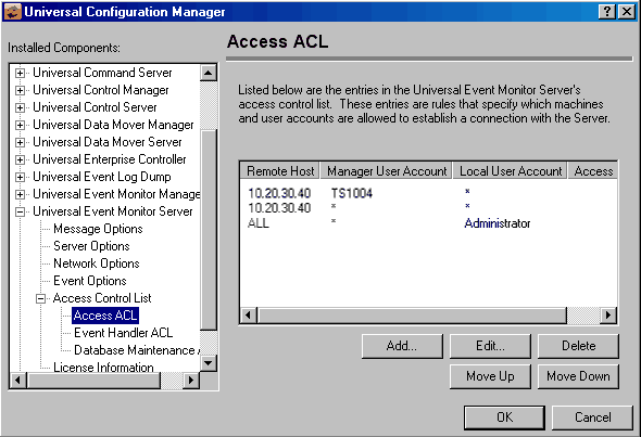 Although UACL files can be edited with any text editor (for example, Notepad), the Universal Configuration Manager application, accessible via the Control Panel, is the recommended way to update UACL entries. From there, ACL entries can be added, changed, deleted, or sorted (rules are applied in the order in which they are listed).