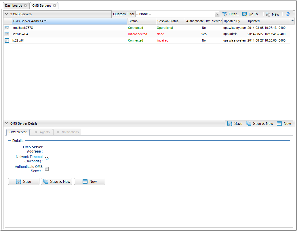 To check for your newly installed OMS Server, select System > OMS Servers from the Agents & Connections navigation pane. You will see a list similar to the following example, which includes the OMS Server that you just installed as part of the Agent package. Make sure the OMS Server Status is Active.