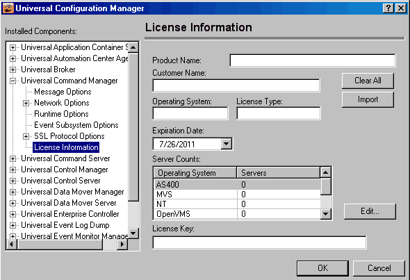 - Specifying the information on the Universal Configuration Manager License Information page for that component, either by.