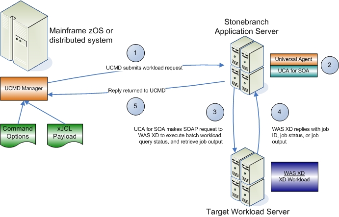 Step 6 | UAI validates the command options and builds a SOAP message containing the command options and xJCL and sends it to UAC. This is a request / reply operation, so UAI blocks for the reply. |