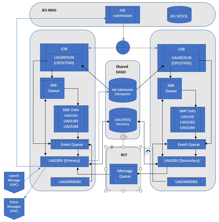 UAG utilizes a message communication channel using XCF services. Secondary UAGSRVs generate messages to the Primary UAGSRV to track the life cycle of a job. Secondary UAGSRVs do not communication directly with the Controller.