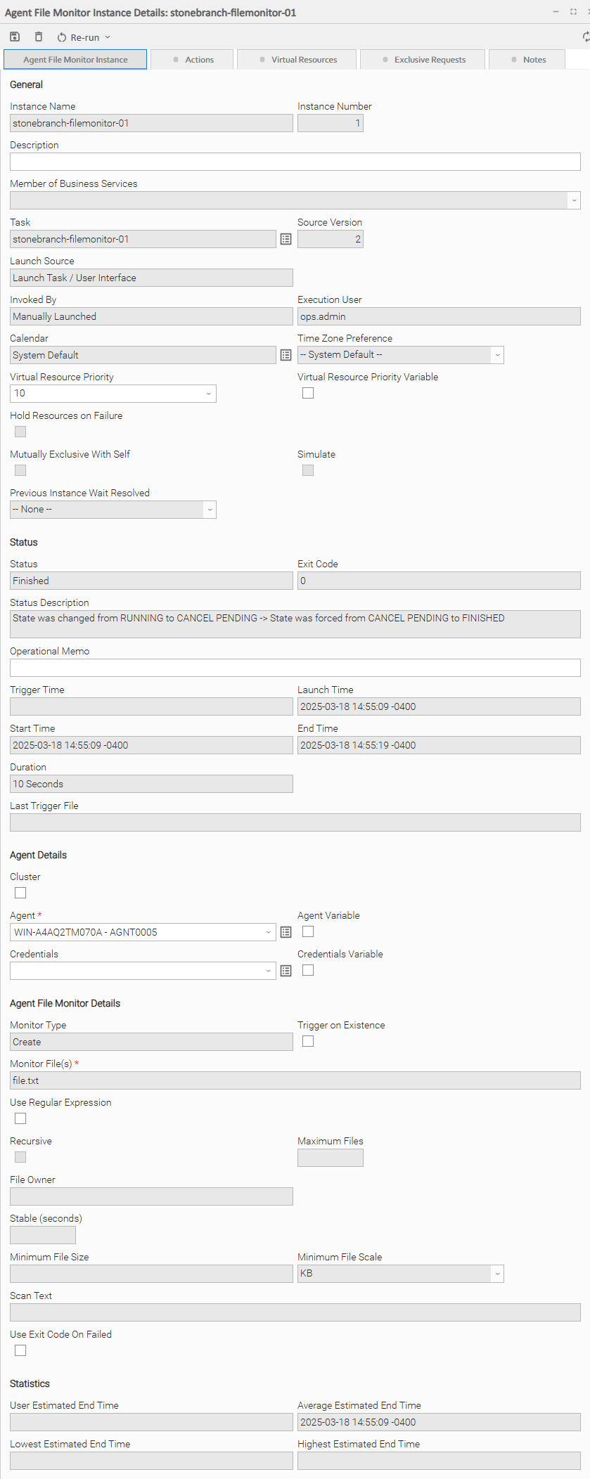 When you launch an Agent File Monitor task from an Agent File Monitor trigger, you cannot manually cancel or force finish the task. You can only stop the task by disabling the trigger. If you manually disable the trigger while the task is still running, the task goes to FINISHED status.