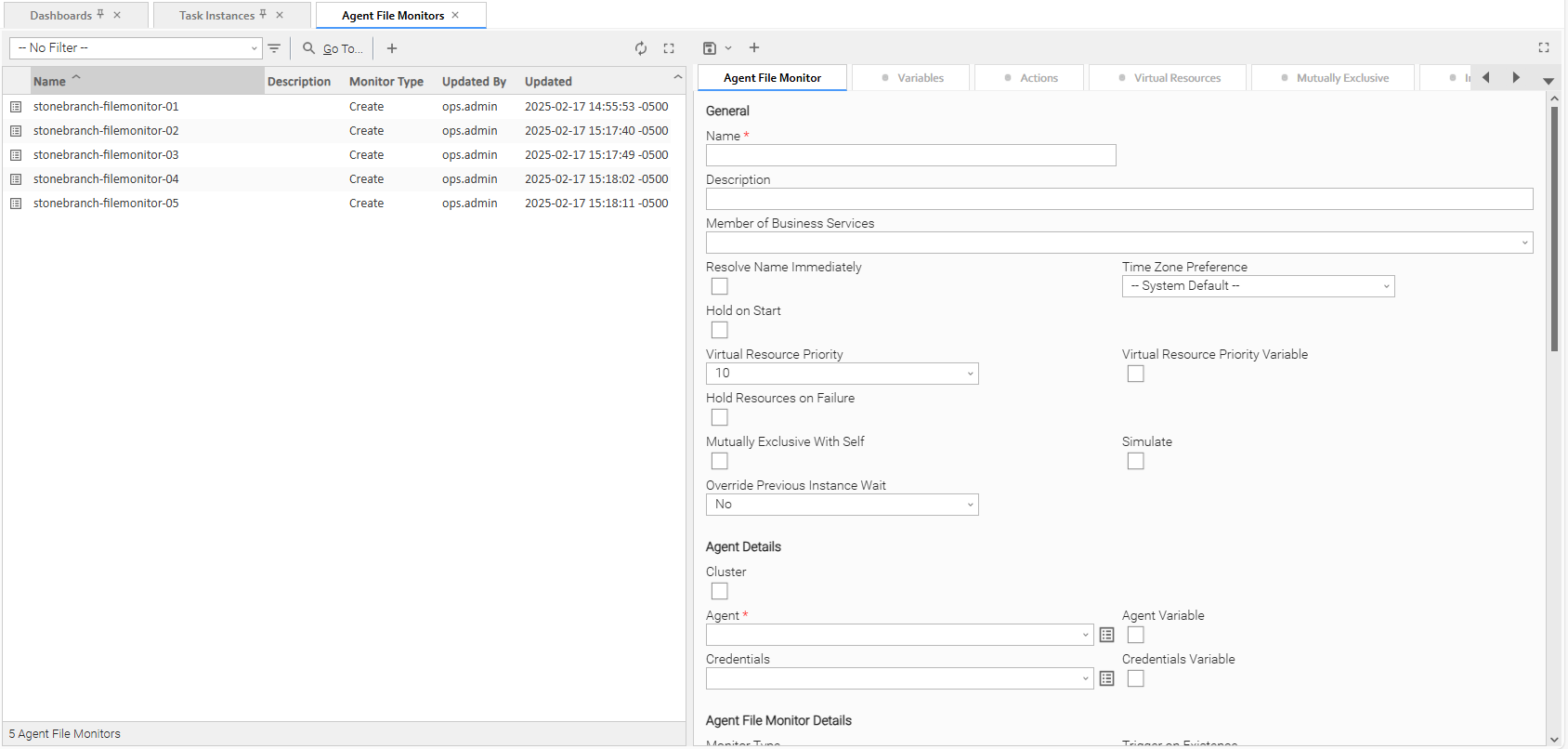 Depending on the values that you enter / select for these fields, and whether or not the Agent File Monitor task has ever been launched, more (or less) fields may display. See the field descriptions, below, for a description of all fields that may display in the Agent File Monitor Task Details.