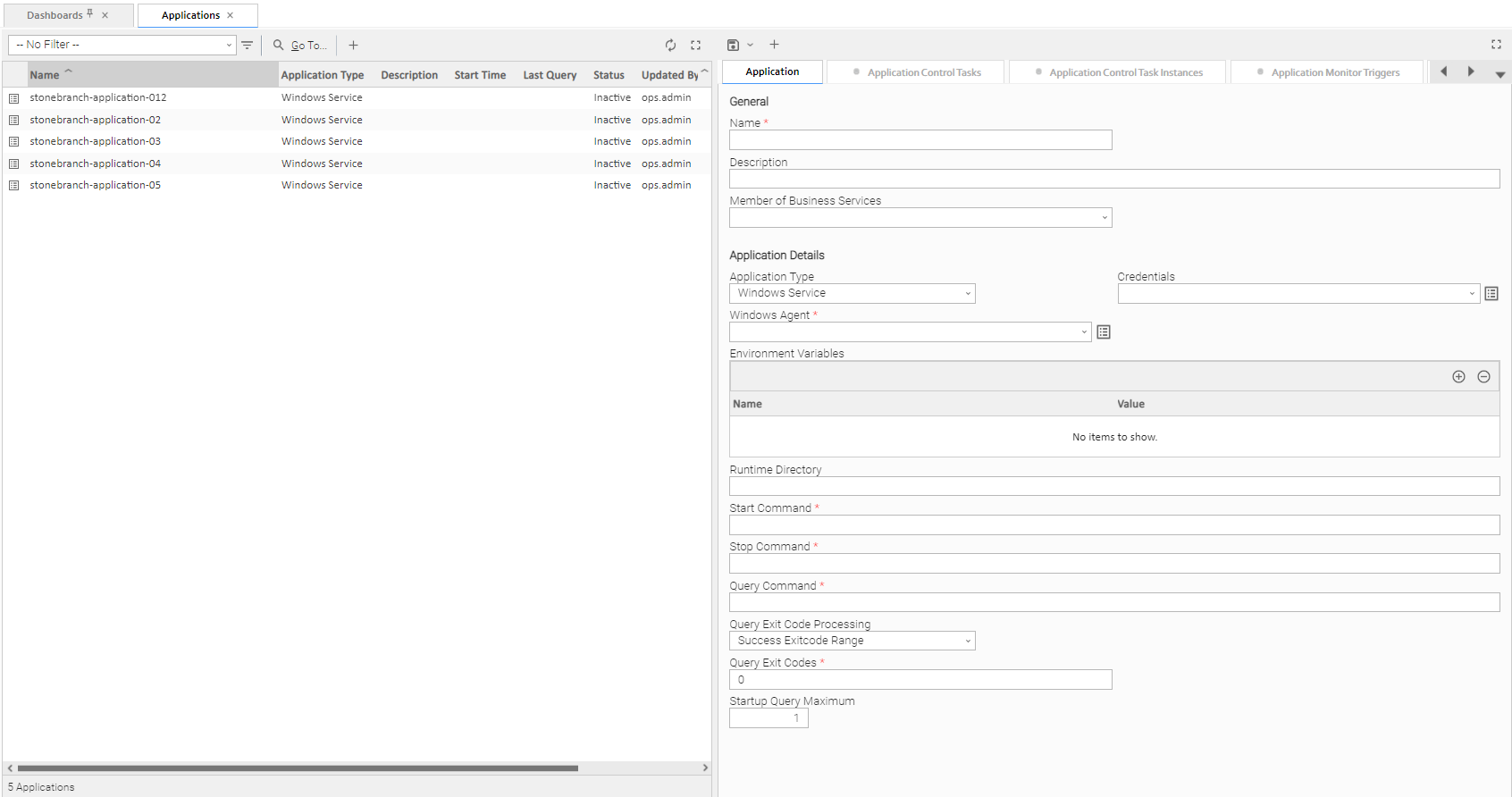 You can also use Application records and their associated Application Control tasks to start, stop, and query applications as part of your scheduling processes. You can execute Application Control tasks as you would execute any other task and include them in Workflows where applicable. In addition, you can define Application Monitor triggers to automatically launch one or more tasks of any type, depending on the status of one or more applications. For example, you might set up an Application Monitor trigger that sends an email to Windows technical support personnel if any Windows application goes to Impaired or Inactive status.