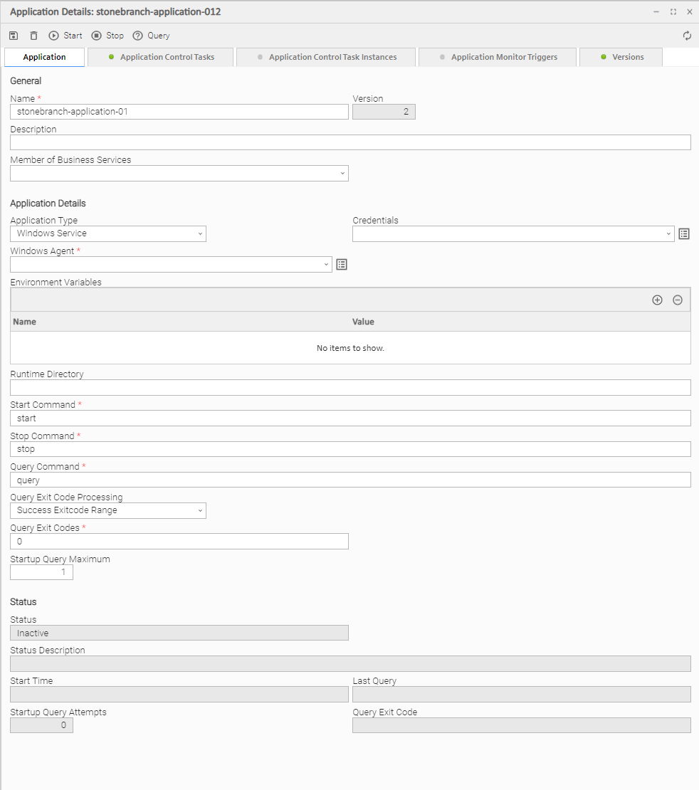 Windows Agent | If Application Type = Windows Service; Name of the Windows agent where the application will run. |