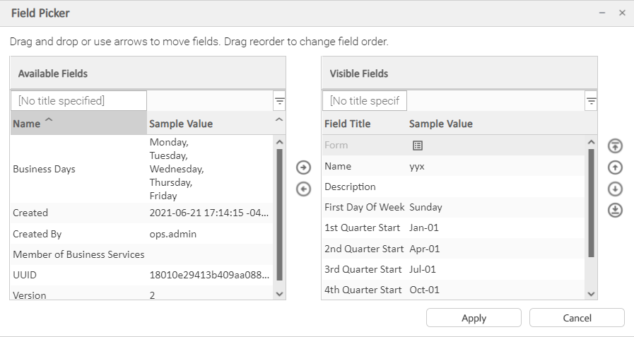 The following Field Picker pop-up dialog identifies the Calendars list columns that are: