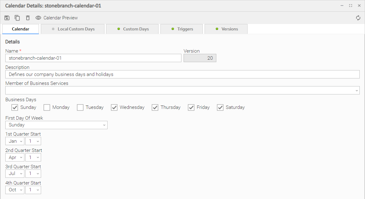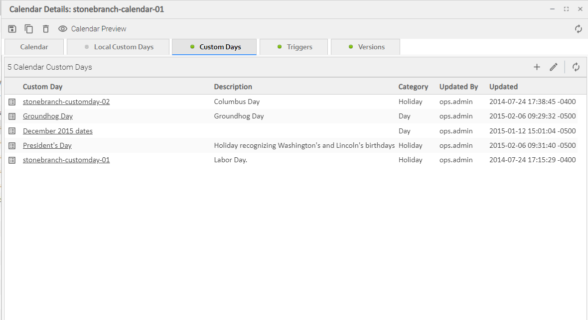 Custom Days | Lists all global custom days associated with this calendar. info The Custom Days tab displays in Calendar Details only if the Custom Day Global Permitted Universal Controller system property is set to true. |