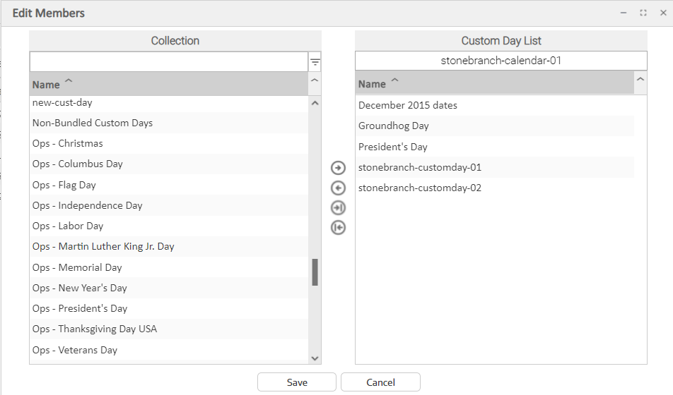 Step 5 | To assign a Custom Day to the calendar, move it from the Collection window to the Custom Days List window: