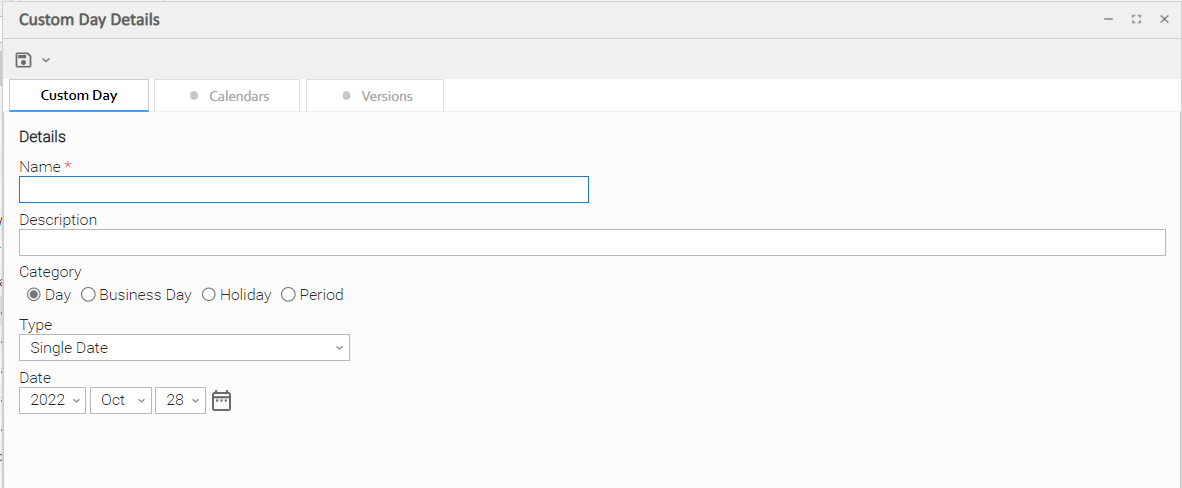 Step 4 | Enter / select Details for a new Custom Day (see Custom Day Details Field Descriptions). |