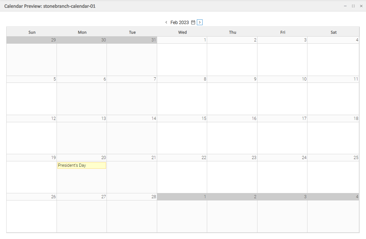 If you click the Calendar Preview button in the Calendar Details, the Controller provides a month-by-month display, for the number of years specified in the Calendar Preview Future Period In Years Universal Controller system property (starting from the end of the current year) and months in the past as specified in the Calendar Preview Past Period In Months Universal Controller system property , of all Custom Days defined for this calendar.