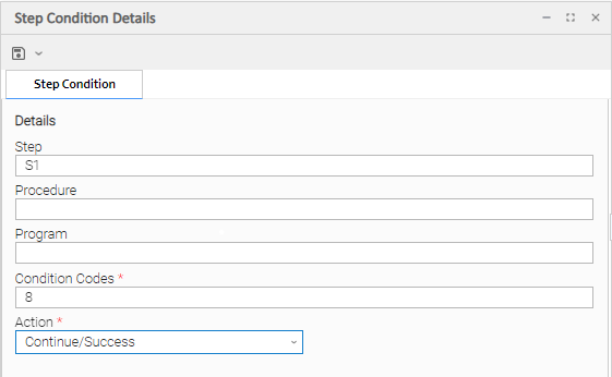 In this example, if the condition code of any procedure step executed as job step S1 is equal to 8, the job continues and the task status is set to SUCCESS.
