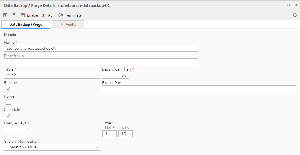 Audits | Lists audits created for all scheduled runs of this data backup / purge operation. |