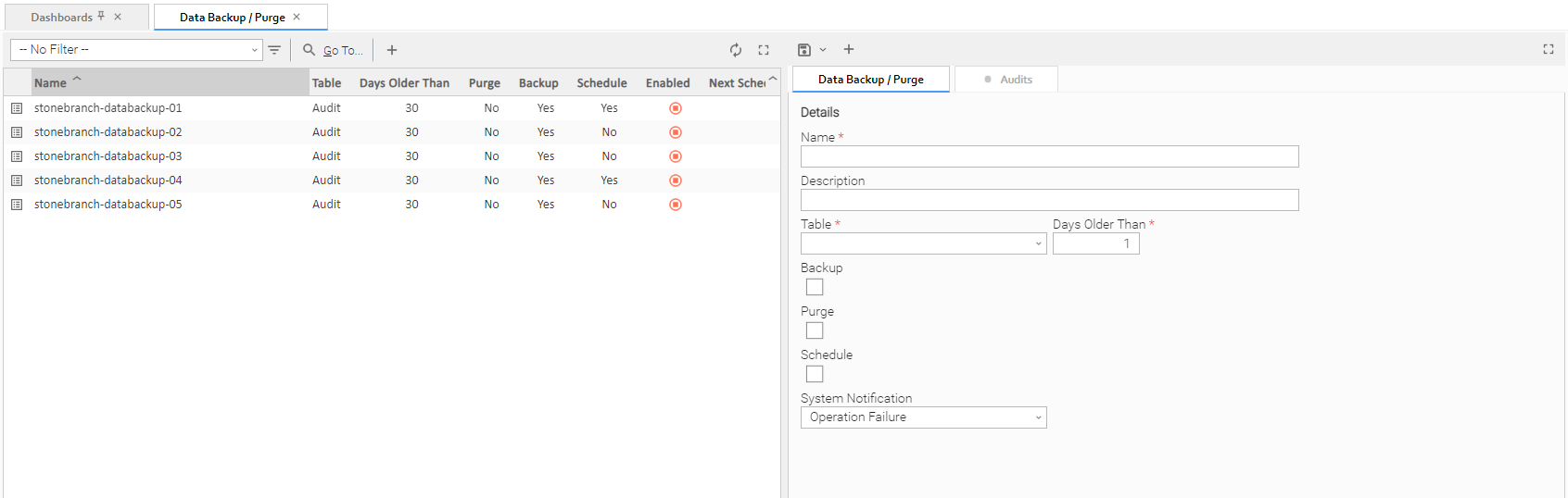 Step 1 | From the Administration navigation pane, select Data Backup / Purge. The Data Backup / Purge list displays. To the right of the list, Details for a new Data Backup / Purge record displays.