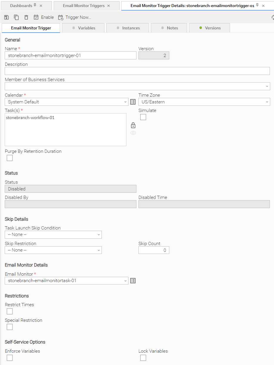 Enforce Variables | Specifies whether or not to enforce Override Trigger Variables when using Trigger Now... from the User Interface. |
