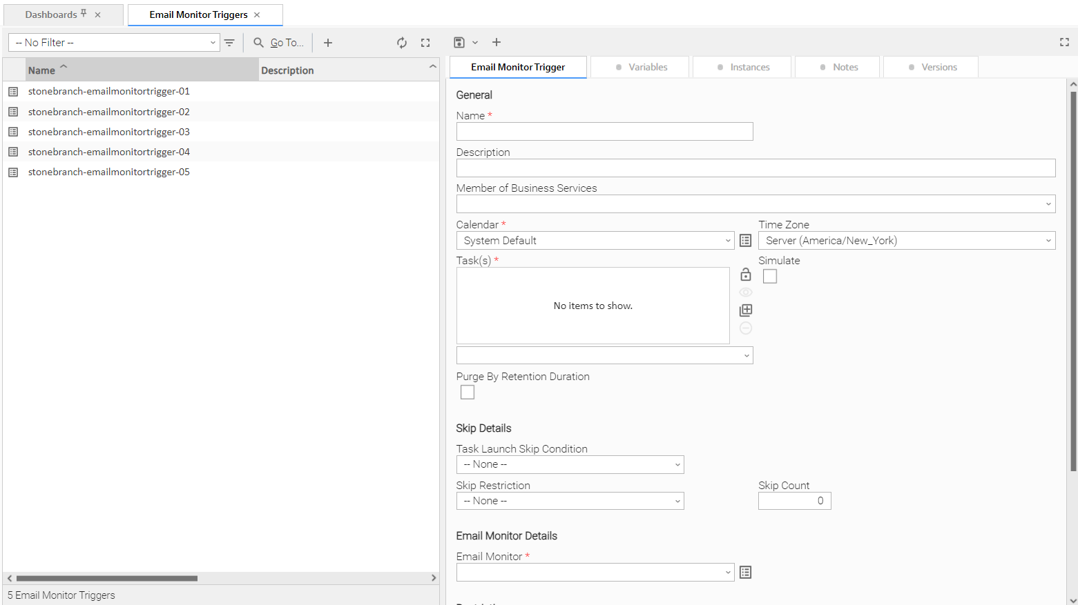 Step 1 | From the Automation Center navigation pane, select Triggers > File Monitor Triggers. The Email Monitor Triggers list displays. Below the list, Email Monitor Trigger Details for a new Email Monitor trigger displays.