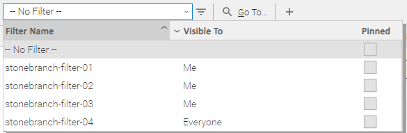 The list identifies the name of each Filter, to whom the Filter is visible, and whether or not the Filter is pinned. |