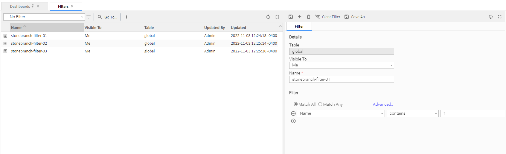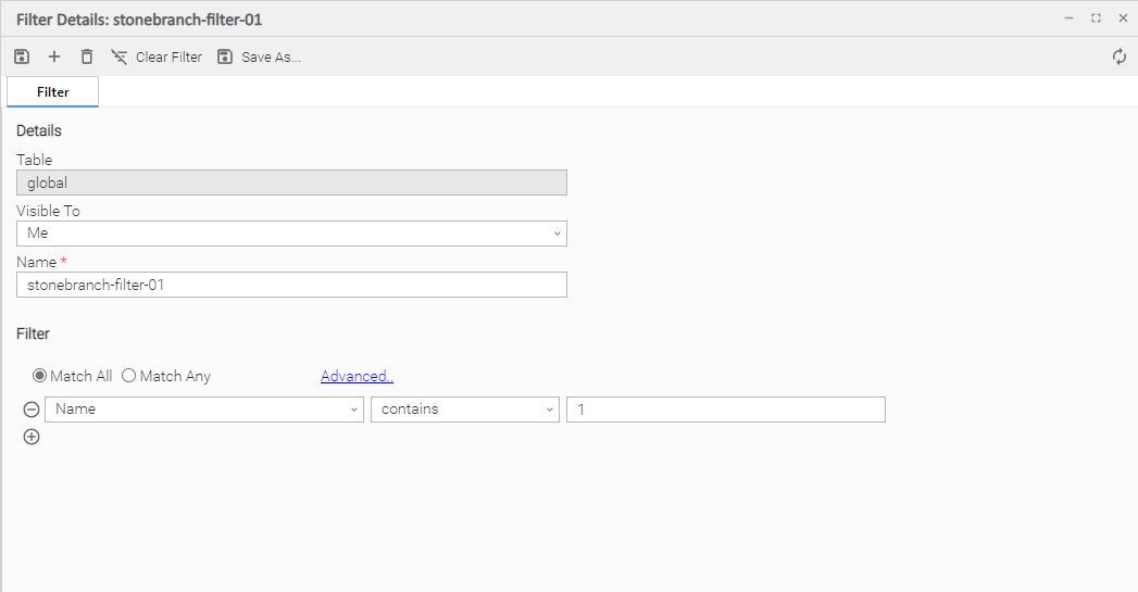 Match All | Specifies that when this Filter is applied, the list will displays all records that match all of the criteria. |