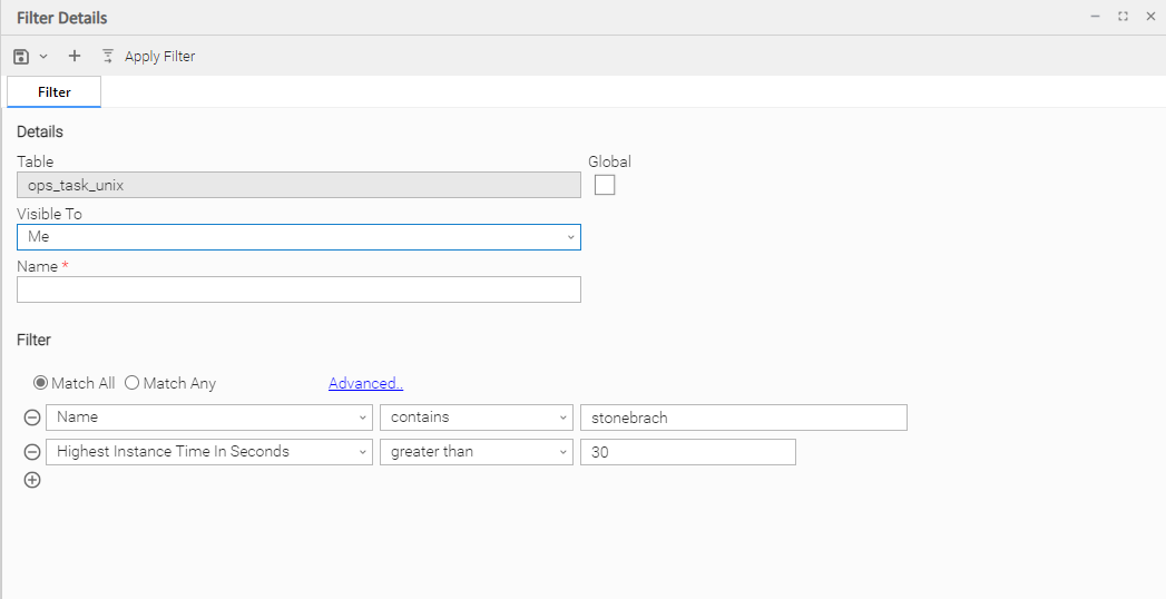 Apply this filter criteria to list all tasks for which the Highest Instance Time in Seconds is greater than 30 and the task Name contains the characters stonebranch.