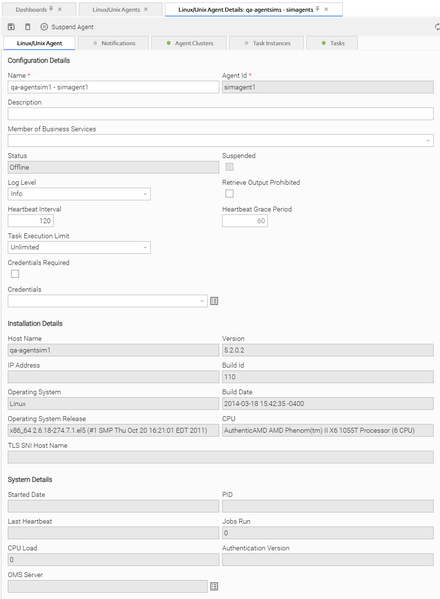 Linux/Unix Agent Details provide the information necessary for the scheduler to locate and communicate with the machine where the Agent resides. Universal Controller creates this record automatically when the Agent connects with the Controller.