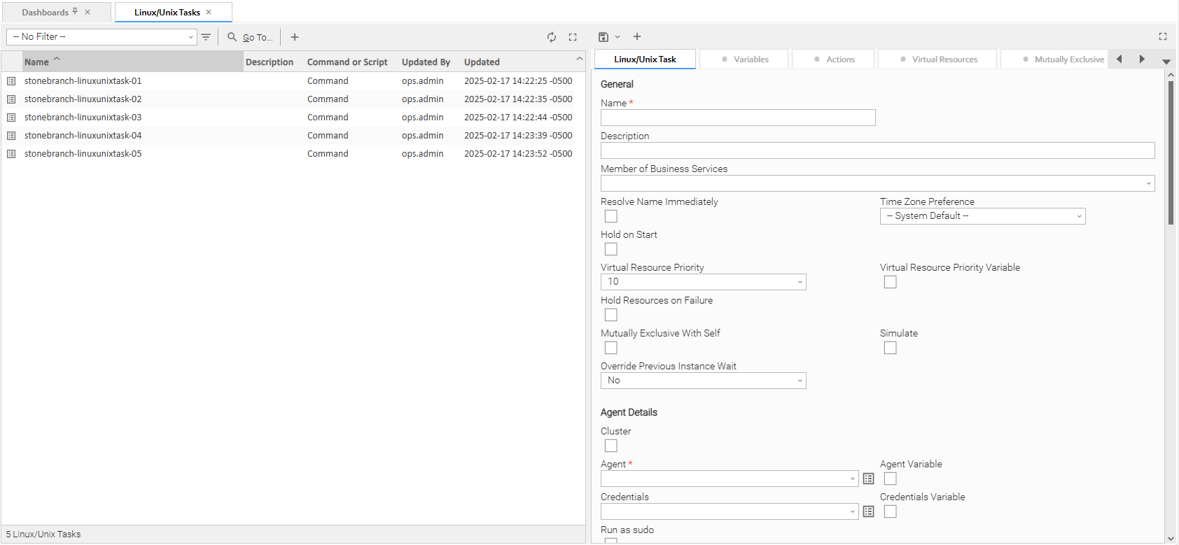 Step 1 | From the Automation Center navigation pane, select Tasks > Linux/Unix Tasks. The Linux/Unix Tasks list displays a list of all currently defined Linux/Unix tasks. To the right of the list, Linux/Unix Task Details for a new Linux/Unix task displays.