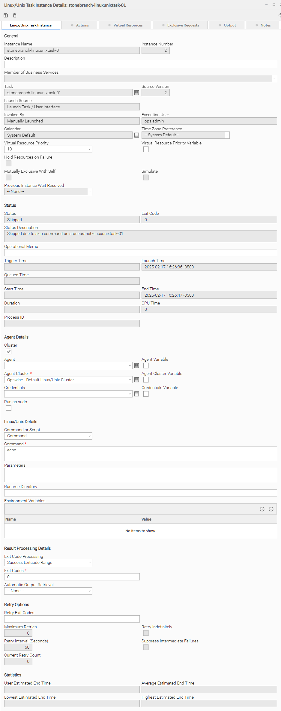 The following Linux/Unix Task Instance Details contains information on the execution of the task shown in the Linux/Unix Task Details.