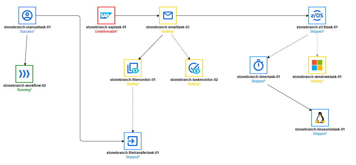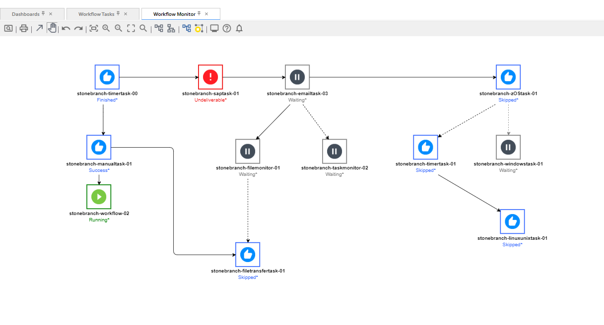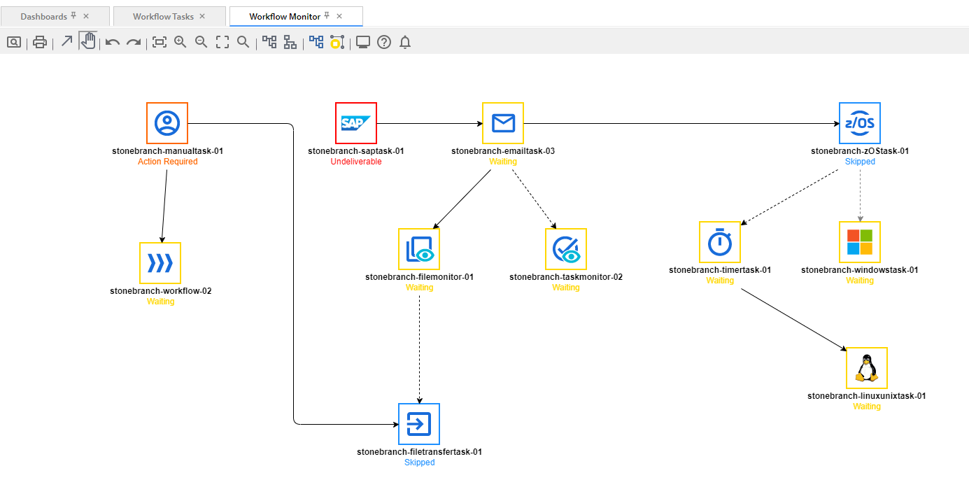 Universal Controller allows you to monitor running Workflows in graphical format. As the Workflow progresses, the display provides up-to-date textual and color-coded status information for each task instance in the Workflow. You can also intervene in processing where necessary.