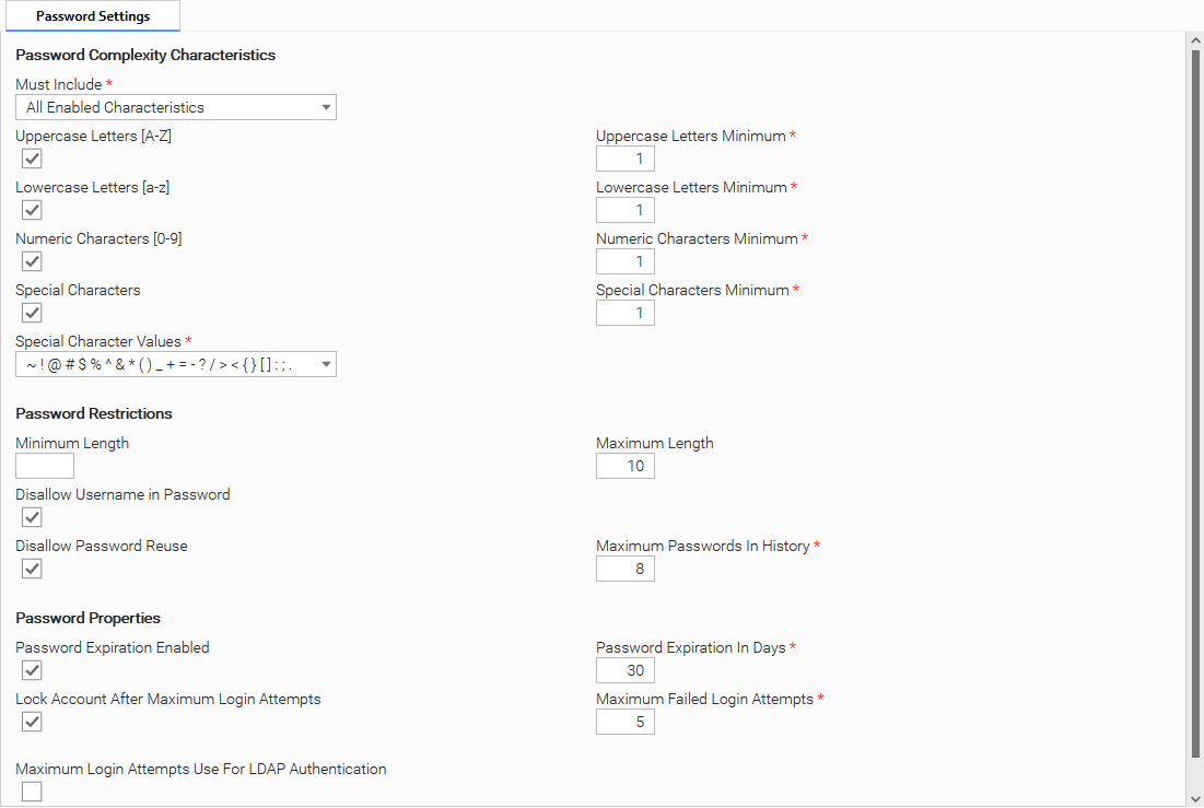 If enabled, the Special Characters Minimum field and Special Character Values field display.