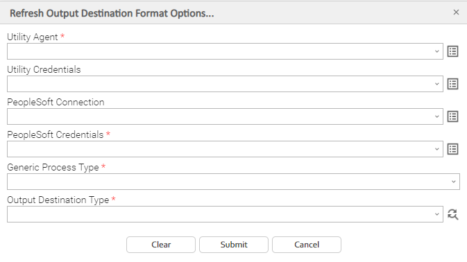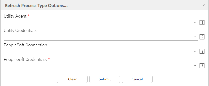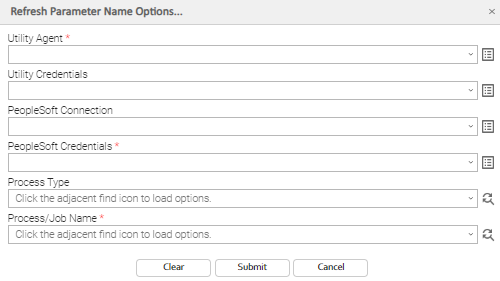 Step 5 | For each field on the Refresh Parameter Name Options... dialog, you can select from a list of values that may have changed since the last time that a value was selected. Most of the fields on a Refresh Options... dialog are fields from the PeopleSoft Task Details, and the values for those fields in the dialog are, by default, the same as the values for the fields in the Details. You can keep the current values or change them from their drop-down lists. When you click the Submit button on the Refresh Parameter Name Options... dialog, the drop-down list for the Parameter Name field in the RunTime Parameter Details is populated with values that are determined by the values that you submitted on the Refresh Parameter Name Options... dialog. |