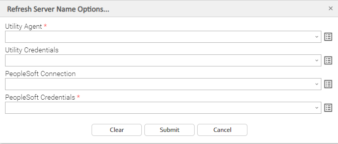 PeopleSoft Credentials | Login credentials that the Controller will use to access the PeopleSoft system. The credentials are stored in the Universal Controller credentials table; see Credentials. info Either the PeopleSoft Connection or the PeopleSost task using that connection must specify PeopleSoft Credentials. If a PeopleSoft task using the PeopleSoft Connection specifies PeopleSoft Credentials, those PeopleSoft task credentials override the PeopleSoft Connection credentials. |