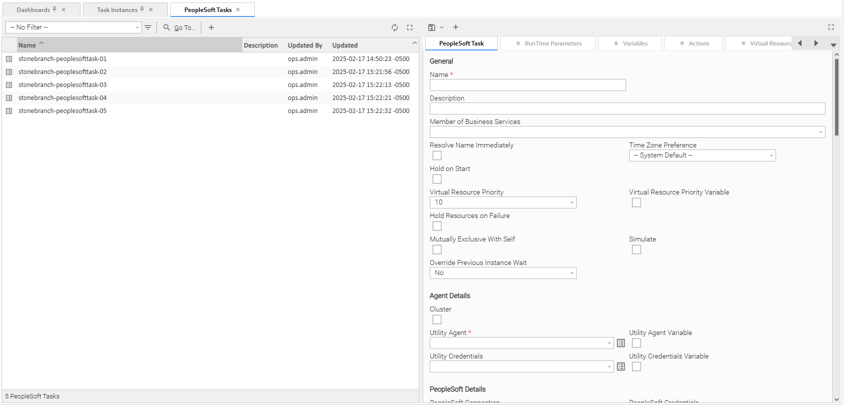 Step 1 | From the Automation Center navigation pane, select Tasks > PeopleSoft Tasks. The PeopleSoft Tasks list displays a list of all currently defined PeopleSoft tasks. To the right of the list, PeopleSoft Task Details for a new PeopleSoft task displays.