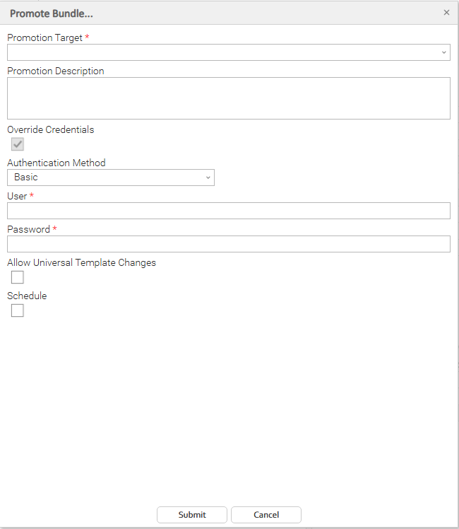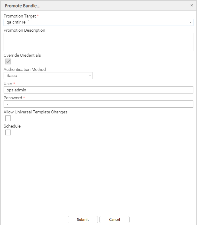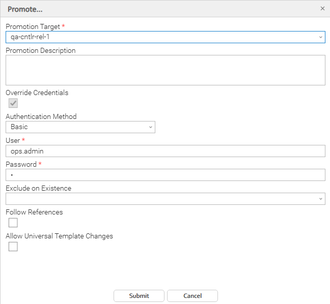Step 4 | The default login User and Password, or Personal Access Token is provided from the selected Promotion Target record. If you want to override the defaults, click Override Credentials. From the Authentication Method dropdown menu, select Basic to override using a username and password or select Access Token to override using a personal access token. If the promotion contains new or modified Universal Templates, click Allow Universal Template Changes; otherwise, the promotion will not succeed. See Diagnosing Promotion Failures for details. |