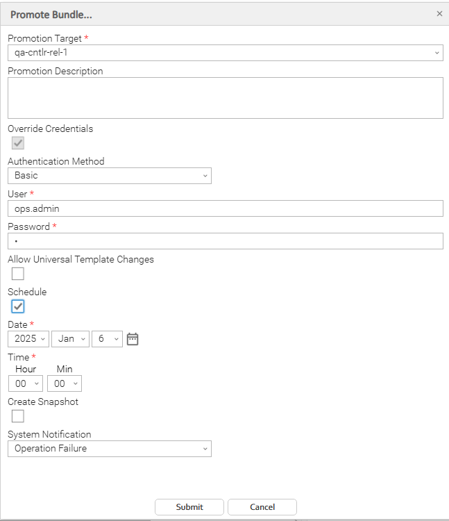 Step 6 | Click Submit. The Controller logs in to the target machine specified in the URI field of the Promotion Target record and copies the bundled records to the target Controller. Based on the specified Agent mapping, the target Agent replaces the source Agent where required. If you scheduled the promotion to be run at a later time, a record of the promotion is created in the Promotion Schedules list. info The promotion process creates audit records on the source and target machine. On the target machine, the Controller also creates a Promotion History record. For details, see Promotion History and the Restore Option. |