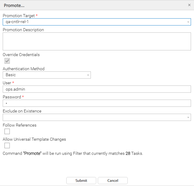 Follow References | If the Follow References field is enabled for a promotion, the following references are followed for Universal Tasks: Agent Cluster (or Broadcast Cluster), Credentials, and any fields that match a Universal Template Credential Field Type, in additional to the references inherited by all Task Types. See Records Promoted When Follow References is Selected or Not Selected. |