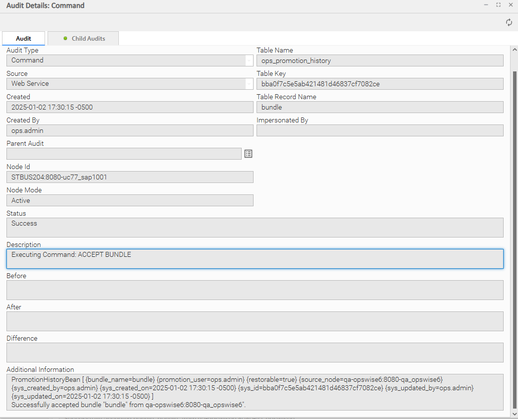 The following examples show an ACCEPT BUNDLE record on a target machine and a Child Audit record for a task included in the Bundle promotion.