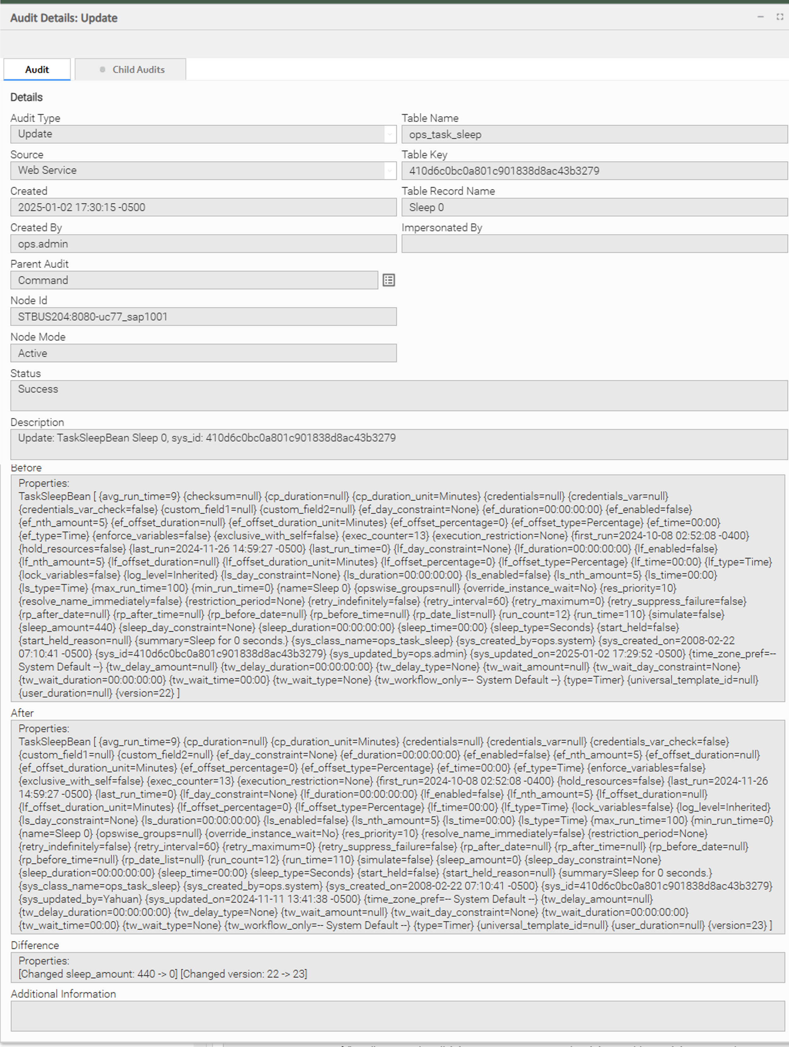 Child Audit | For any promoted Universal Template change, a child audit captures the Universal Template Properties, Fields, and Field Choices in the Before, After, and Difference fields. |