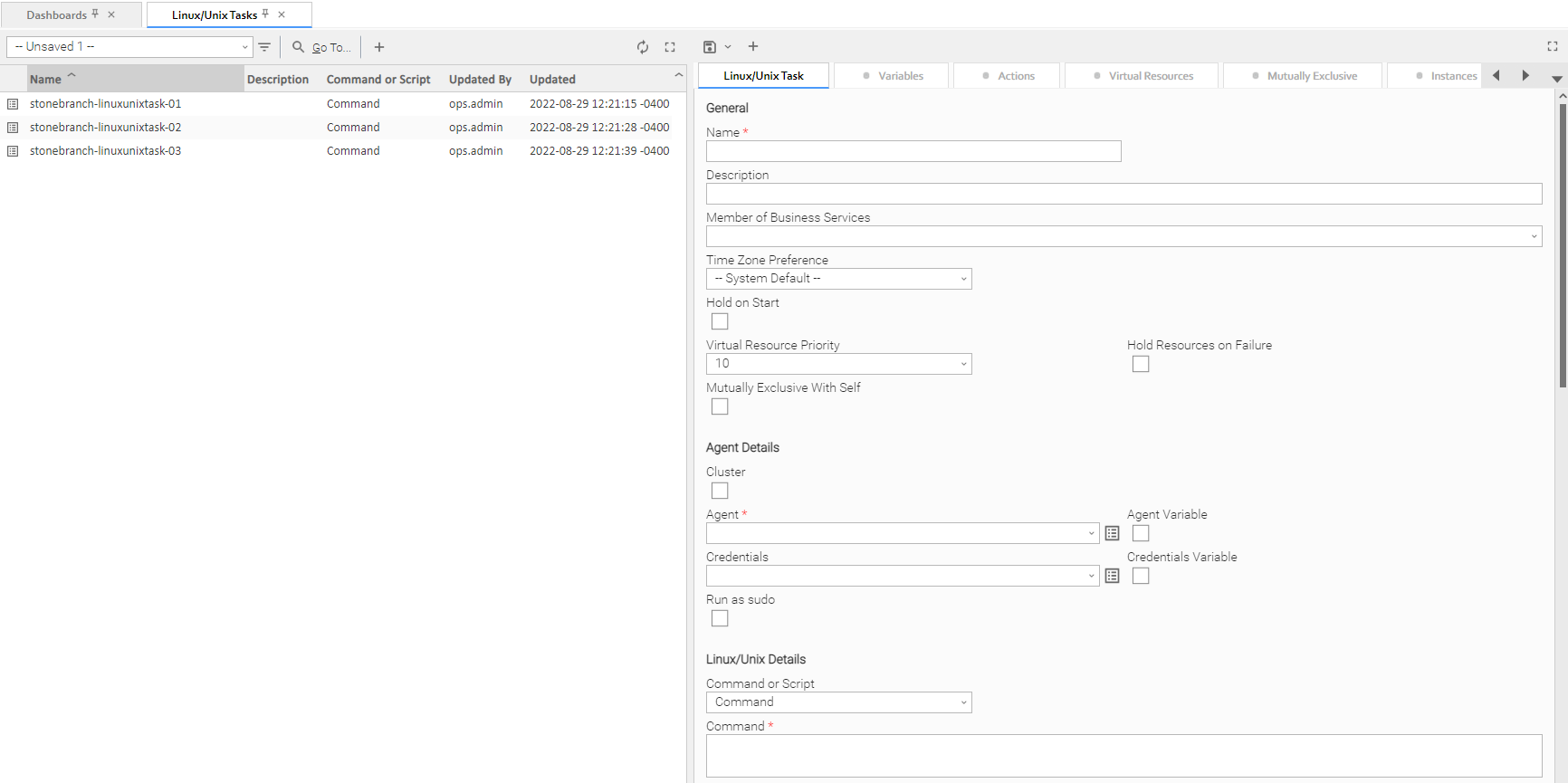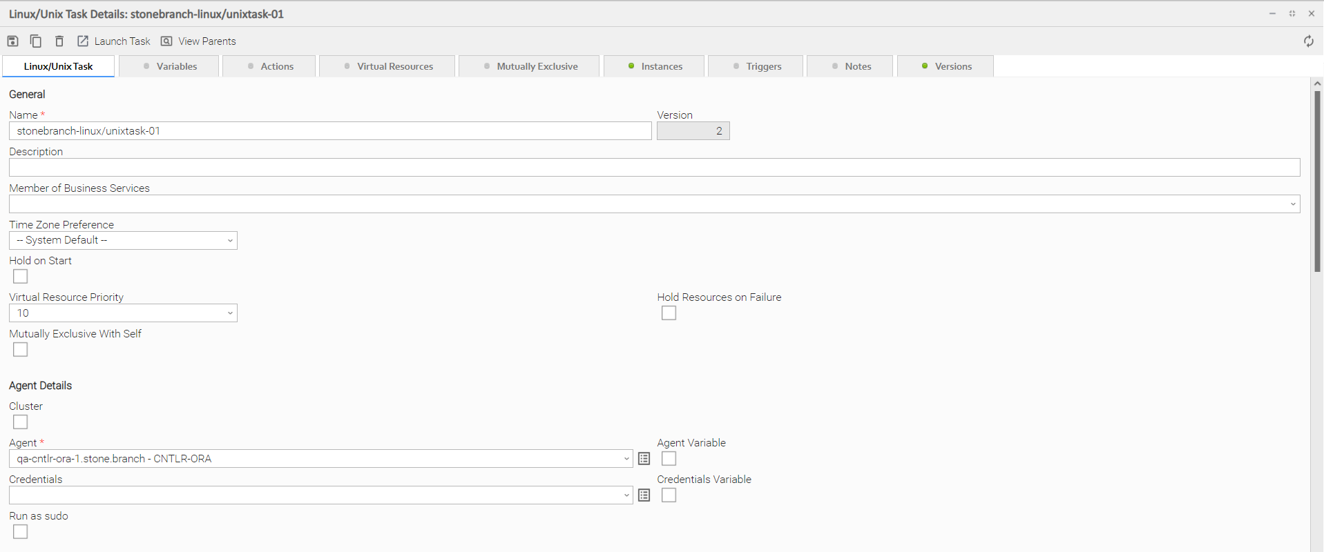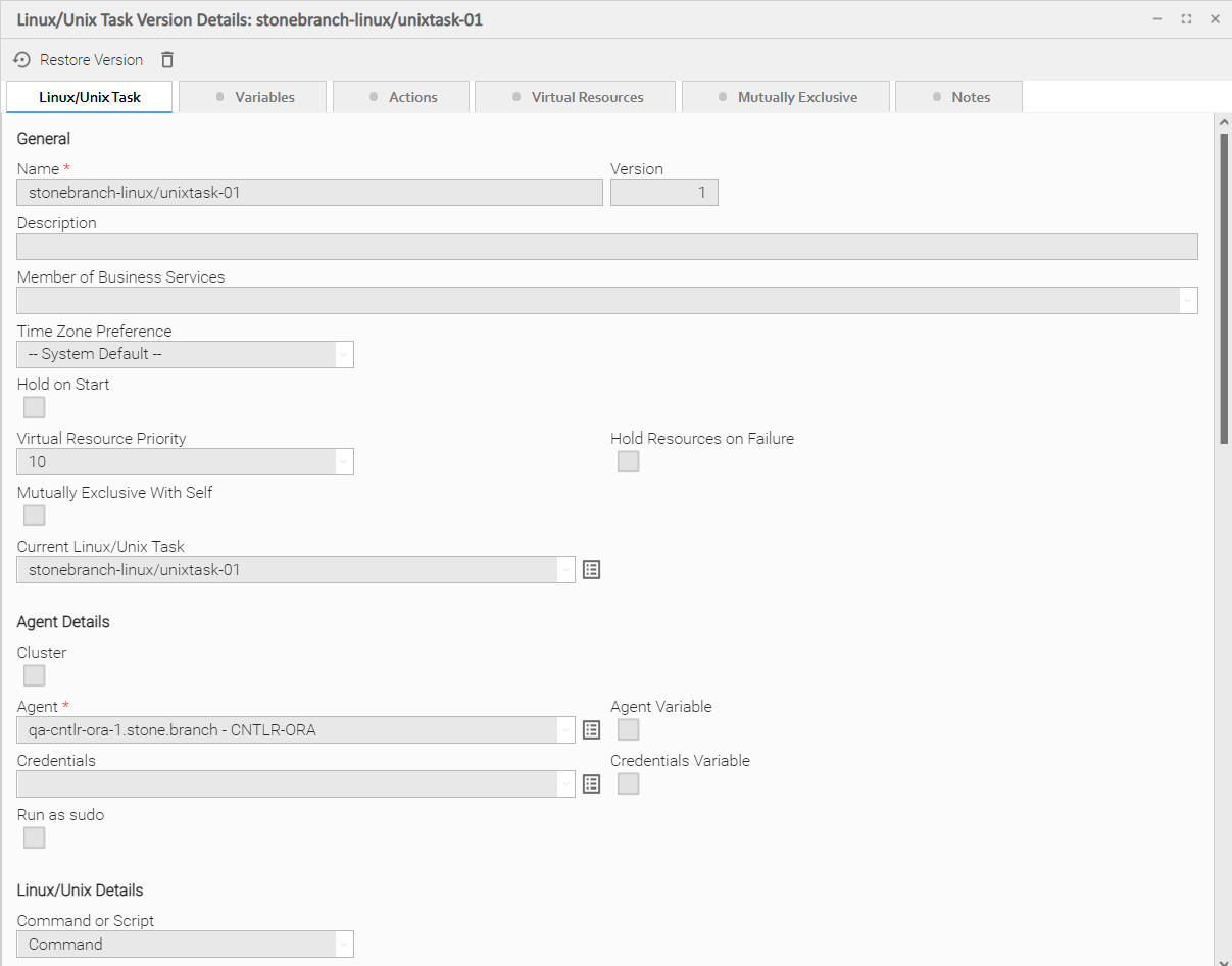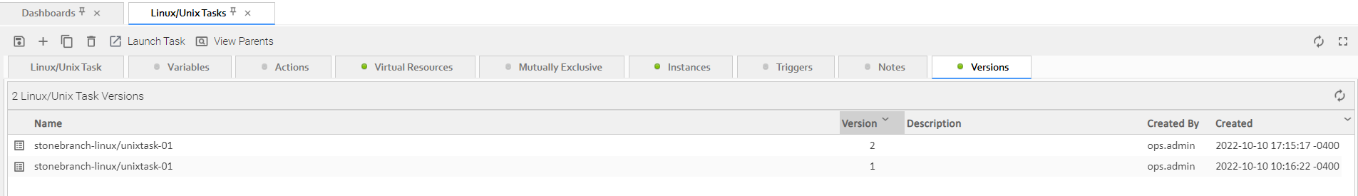 For example, this Linux/Unix Task Details shows that there are one or more records under the Virtual Resources and Versions tabs:
