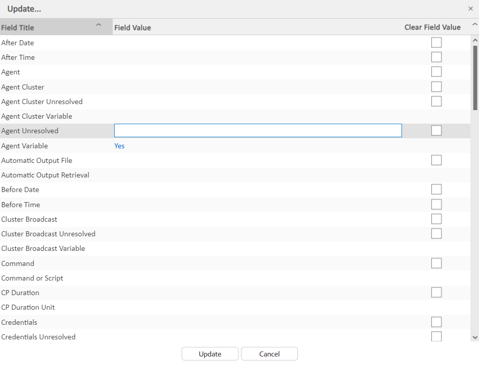 In the Update / Update Filtered dialog for multiple tasks, the Agent field is not converted into a text field if you select Agent Variable. Instead, an additional field - Agent Unresolved - is provided, into which you enter a variable, variable and text, or Agent name. The Agent field is not used.