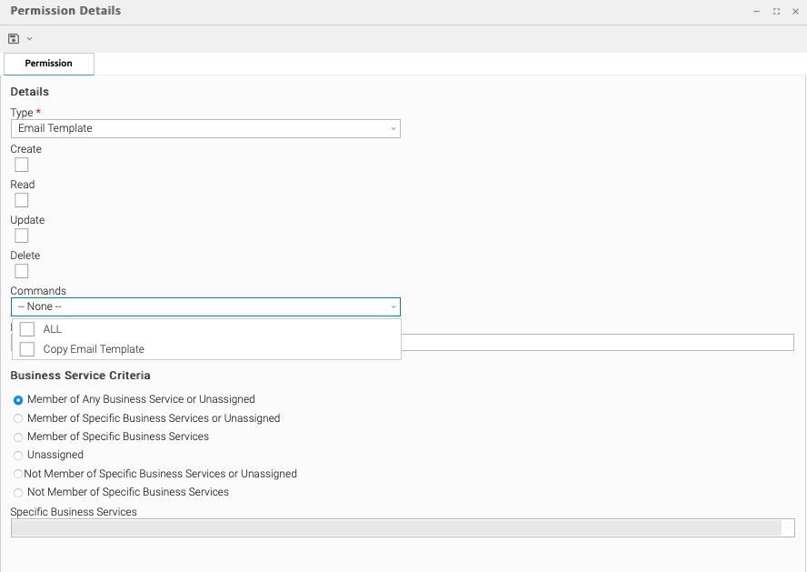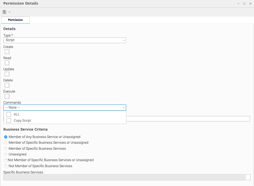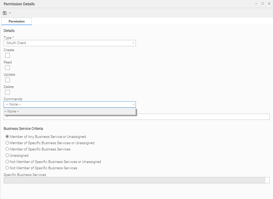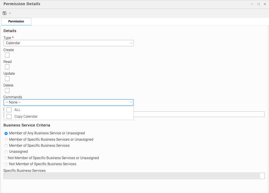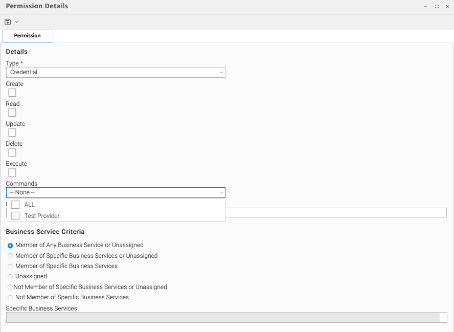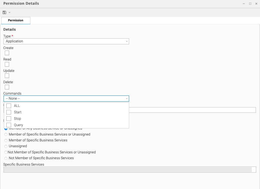 This section contains criteria for selecting records to apply permissions by their business service membership.
