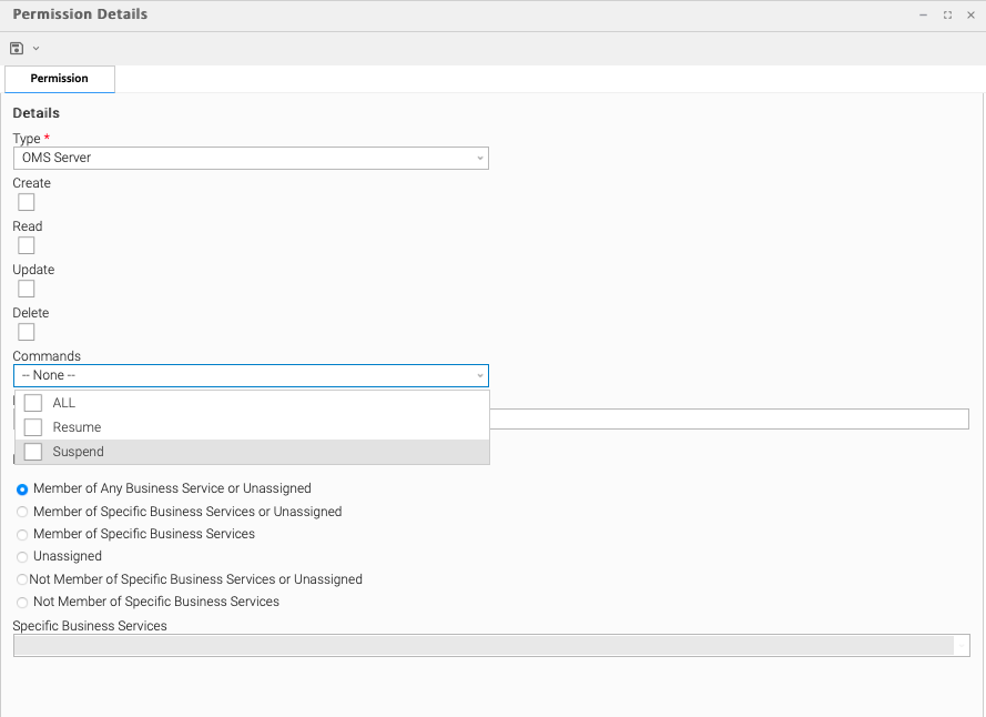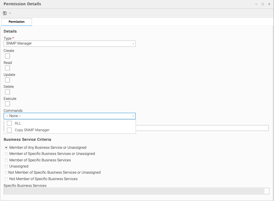 Read | Grants permission to read an SNMP Manager. The Read check box will be checked automatically if the Business Service Visibility Restricted Universal Controller system property is false. |
