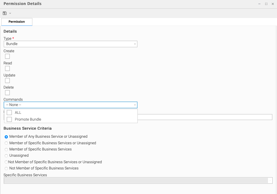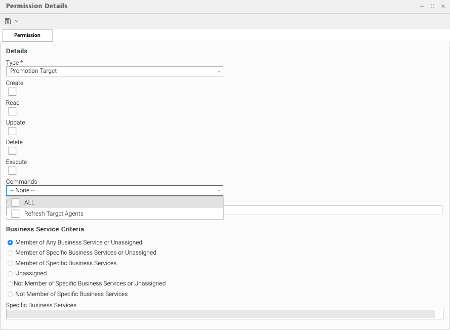 Execute | Grants permission to promote a Bundle using a Promotion Target matching both the specified name wildcard and business service membership, assuming the user has both Read permission and Promote Bundle command permission for the Bundle. |