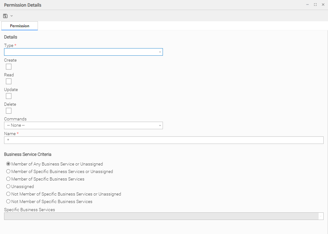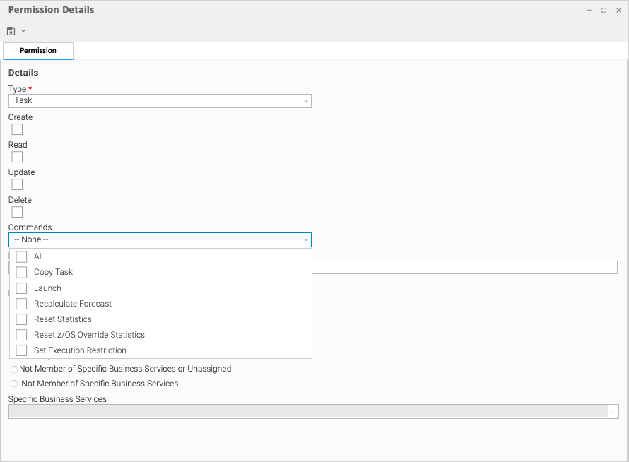 You can further narrow down which records each permission applies to by specifying either name parameters or Business Services. For example, a given permission might apply only to tasks whose name begins with "SF," or a permission might apply only to tasks that have been assigned to a specific Business Service or to tasks that do not belong to any Business Services. See General Permissions Field Descriptions, below, for more details.