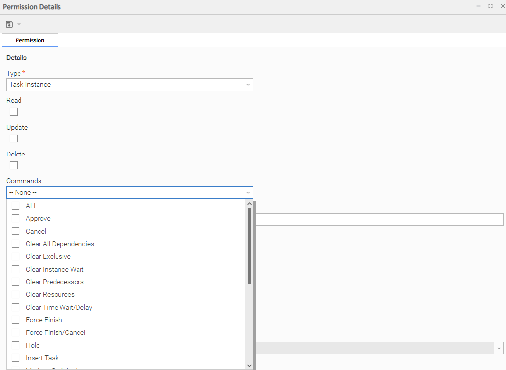 Create | Task instances are created automatically when the task launches, so the Create permission does not appear. |