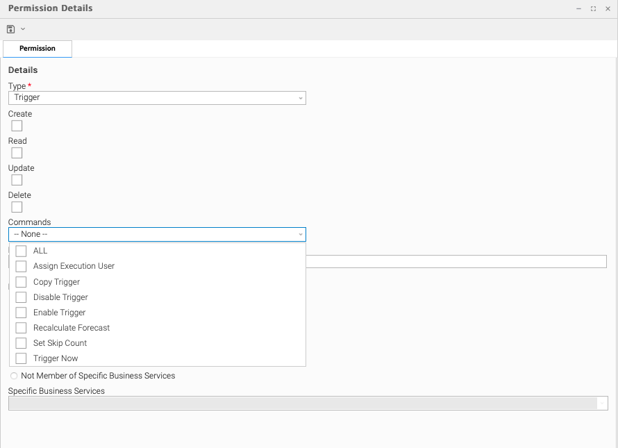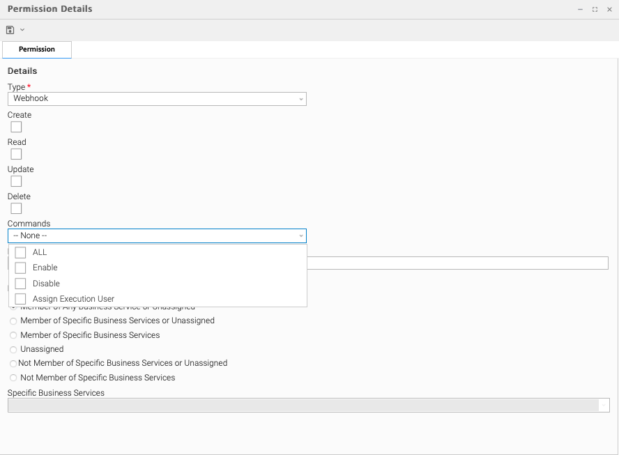 Step 4 | Select permissions for the selected user or group. The permissions available differ depending on the Type of permission that you select. Available permissions are Create, Read, Update, Delete, and Execute. For some record types, additional Commands are available. If the permission does not apply to the record type in the Type drop-down, the permission does not appear in the display. These permissions automatically include other permissions: