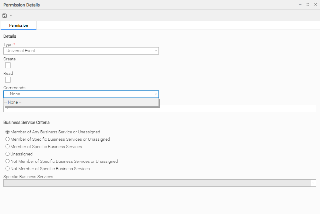 The permission Member of Any Business Service or Unassigned, Unassigned to Business Service, and Member of Business Services applies to the published Universal Event Member of Business Services.