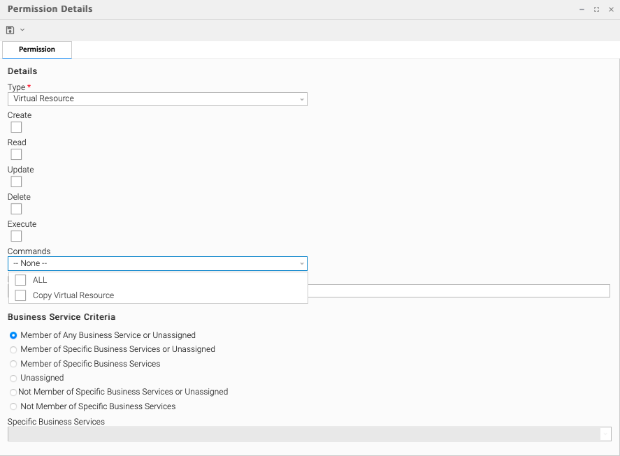 Read | Grants permission to read a virtual resource. The Read check box will be checked automatically if the Business Service Visibility Restricted Universal Controller system property is false. |