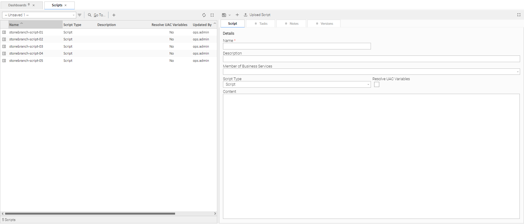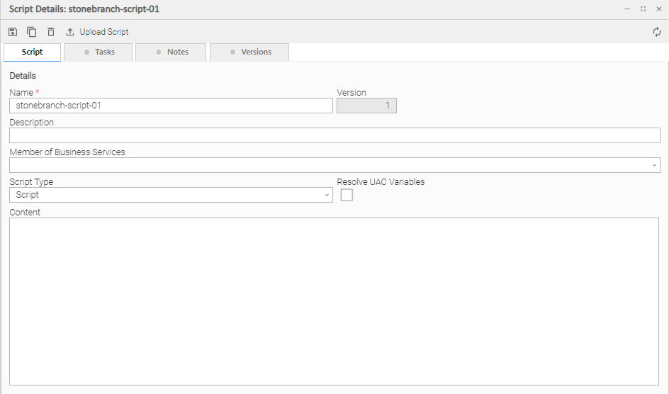 Upload Script | Allows you to upload a script from the local file system and place it in the Content field (see Uploading a Script, below). |