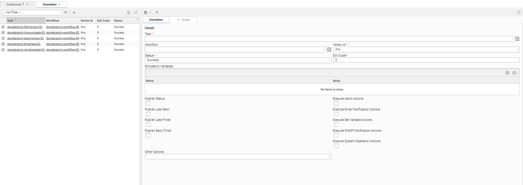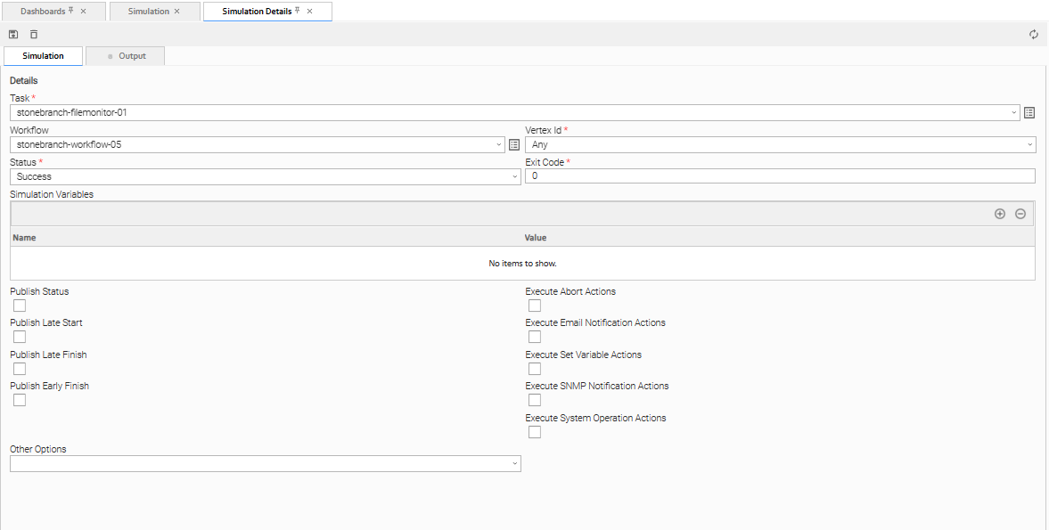 Simulation allows you to validate the execution of a workflow, a specific set of tasks within a workflow, or a standalone task in the Universal Controller without actually having to execute the underlying operation of each task instance.