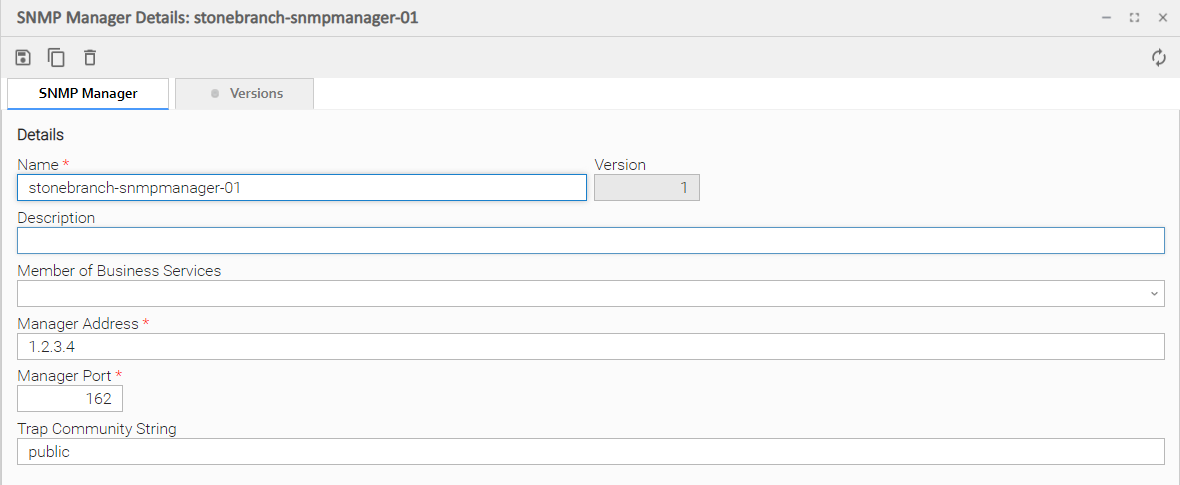 The following SNMP Manager Details is for an existing SNMP Manager. See the field descriptions, below, for a description of all fields that display in the SNMP Manager Details.