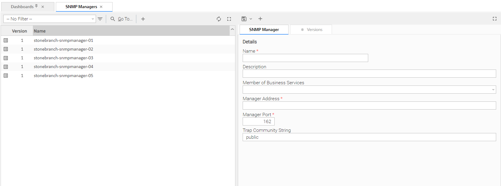 For information on how to access additional details - such as Metadata and complete database Details - for SNMP Managers (or any type of record), see Records.